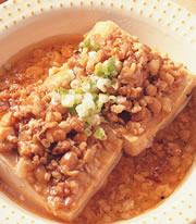 2、锅内入油烧热后,放入日本豆腐,待炸成金黄色后捞起;