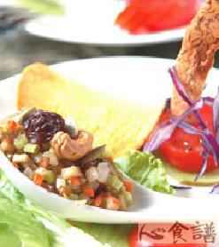 3.辣味洋芋片上先放入拌炒完成的香松,再放综合坚果即可。
