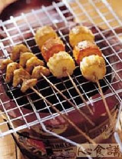 (3)将油膏、果糖、香油调匀备用。将已串好的红白萝卜串及菱角串,放入烤架上烧烤,并涂上酱料,烤至熟透且入味,最后撒上山椒粉即可食用。