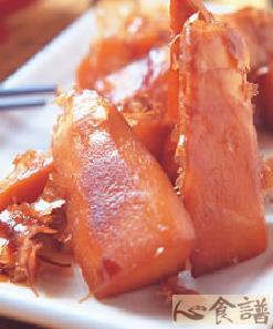 4.取平底锅倒入适量油烧热后,捞起作法3的鲜笋块,放入锅中煎至上色后,淋入作法3中浸泡的鲜美露酱汁,以小火煮至酱汁略收起锅盛盘,再撒上柴鱼片即可。