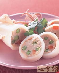 猪绞肉150公克,中卷1尾,鱼浆50公克,青豆仁15公克,胡萝卜丁15公克,蒜末5公克,姜末5公克,太白粉少许,盐1/3小匙,糖1/3小匙,米酒1/2大匙,乌醋1小匙,胡椒粉少许
