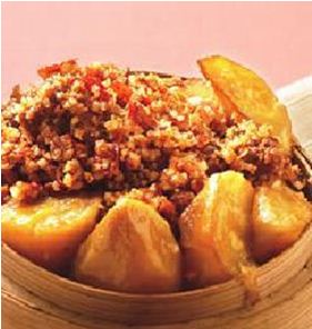 素排骨300公克,地瓜块150公克,辣豆瓣酱2大匙,辣椒酱1大匙,姜末5公克,细砂糖1大匙,素高汤粉1/2茶匙,蒸肉粉40公克