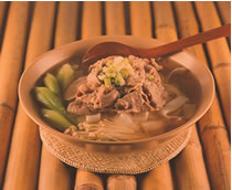 (4)牛腩凉后切片备用。将河粉、青江菜、金针菇分别烫熟,取一汤碗,将河粉放入,上面舖上牛腩片、青江菜、嫩牛肉片、洋葱丝、金针菇,再将煮好的高汤舀入,最后撒上葱末即完成。