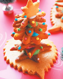 5.取1片叶子造型饼干当作底层,再使用蛋白糖霜作为黏着剂,把星星造型饼干依序叠成一颗树状,最后再用蛋白糖霜点缀出不同颜色作为装饰即可。