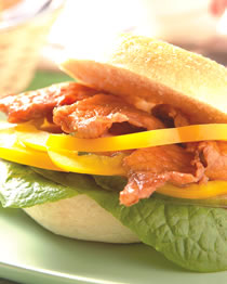 2.贝果横向由中间切开,先放上美生菜,再放数片蕃茄及黄椒片(依个人喜好调整),最后叠上烧肉片,淋上适量的烧肉酱汁即可。