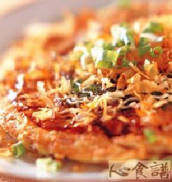 2.平底锅加热后上一层薄油,放入作法1搅拌好的材料,铺成圆饼形,煎煮至表面上色酥脆。