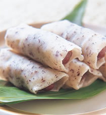 4.在作法3中接触平底锅的煎面放上搓成适当长条的红豆馅后,捲起即可。
