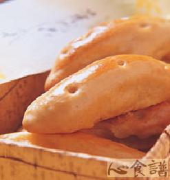 5.将作法3分割成每个15公克,再包入作法4中每个30公克的地瓜馅料后,整成长条形的地瓜外观,再以竹签在外皮上刺上数个小孔,并用刷子涂抹上调匀的蛋黄液涂料即可。