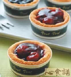 4.将面糰分切成每份约30公克的小面糰,再放入圆形模型中,用手将面糰挤压成小塔皮状后,在塔皮中间处填入蓝莓酱或樱桃酱。