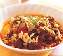 洋葱1个,蒜末150公克,菲力牛肉600公克,青椒适量,红甜椒适量,黄甜椒适量,鼠尾草10片,小茴香粉1大匙,匈牙利红椒粉适量,月桂叶3∼4片,红酒300㏄,香草高汤适量,盐适量