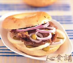 3.将贝果横切成上下两半,在半个贝果上依序摆放作法2的照烧牛肉、洋葱圈、酸黄瓜片,再盖上另一半贝果即完成。
