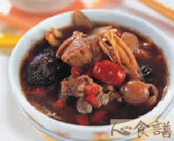 排骨2斤,水20杯,米酒1/2瓶,十全药材:3钱,白芍5钱,炙甘草2钱,桂枝1钱,杜仲2片,黑枣10粒,川芎3钱,熟地3钱,枸杞5钱,黄耆5钱,茯苓3钱,白术3钱,党蔘3钱,盐少许