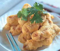 3. 取一中华锅,倒入约6∼7分满量的油,以中火滚至150∼160℃时,将作法1的肉条均匀沾上作法1的面煳,再放入油锅中炸约2分钟,至外表呈金黄色捞出沥干油脂即可,食用时可沾胡椒盐、蕃茄酱、甜辣酱等,口感更佳。