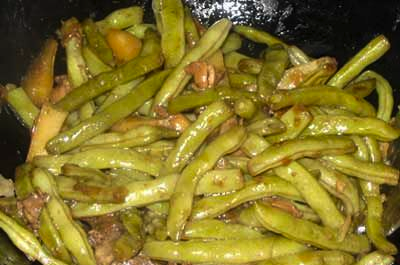 接下来就是炒豆角了。很简单,热油爆葱姜蒜,下豆角进去翻炒至颜色翠绿,中间放鸡肉和土豆。(我是忘了炒鸡肉和土豆了,不过这样反而格外好吃,真不知是什么道理。)然后添开水,烧开。