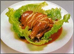 2、炒勺内放油加葱姜煸炒出味,加料酒、酱油、汤、白糖、味精,将鸡腿放入,水干时出锅,改刀码置盘内生菜上即可。
