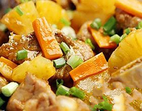 3、取出排骨,然后拍上干面粉,蘸上鸡蛋液,再放入油镬中炸至熟透(记住要用中火油炸,这样,才不会把排骨炸得太过火)。捞出沥干油,洒上胡椒粉,装盘,用菠萝片伴边。