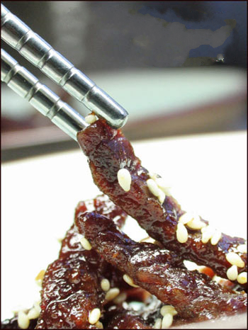 牛肉500公克,芝麻少许,水30㏄,蜂蜜3大匙,盐1/2茶匙