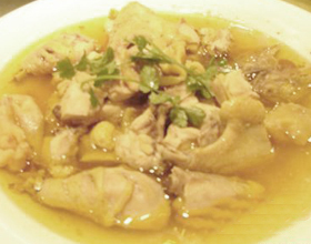 2.勺内放花生油烧热,放入葱段、姜块煸出香味来,倒入鸡块炒至断生,烹入料酒,继续煸炒,加入250克鸡汤、啤酒、精盐、味精,用白糖调成浅黄色,小火炖至鸡肉酥烂时去掉葱、姜,出勺装大汤碗即可。