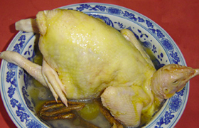 3.将鸡放入炖盅内,上铺放姜片少许盐,洒入料酒,注入适量冷开水,盖上盅盖,放入沸水锅中,隔水约炖五小时左右,候鸡够酥而成。