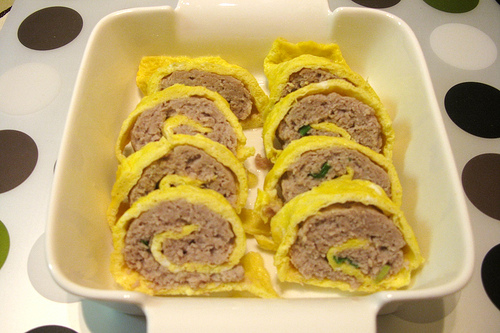 3.另起锅,倒入另一半的蛋液,趁蛋液没有完全凝固的时候,放入刚刚卷好的蛋卷,小心的卷起,然后小火慢慢的煎,煎至内馅完全成熟即可。一定要小火煎,不然外皮已经焦了,内馅还没有熟。