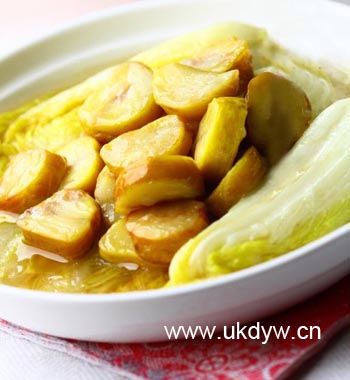1.在板栗凸的一面用刀切一字刀,在开水中烫一下捞出,把板栗肉取出并除去黑膜烂部分,将板栗切成1厘米厚的片,下入油锅用小火炸酥,捞出待用。小白菜摘去边叶留苞洗净。