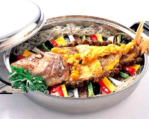 (8)使真鲷的头部向左,肚部向前,并装辣椒丝和丸子放在焖锅里焖熟。