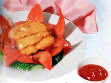1、鱼片切成4.5厘米长、2厘米宽,用调料腌味后粘玉米粉、鸡蛋液,滚上面包屑。番茄用开水烫过去肉改成荷花瓣6-8片,放在盘子里做成荷花状。