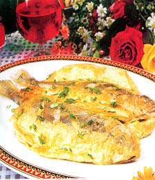 1.把鱼刮鳞除去鳃和下水,用水洗净,两面剞上斜刀口,用精盐卤过,蘸上一层面粉;