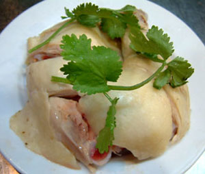 1)先将鸡洗净沥干水分,用5克家乐鸡粉,姜、葱涂抹鸡内胧,用汤将鸡浸至仅熟,过冰汤后斩切成鸡形上碟。
