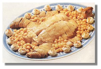 3、将整只嫩母鸡入锅,加水(以淹没鸡为度),放姜片、绍酒,加盖炯烧30分钟左右,至鸡半熟、汤汁趋浓后,再倒入大沙锅内,放入白果、盐,加盖用文火烧15分钟左右,至鸡肉酥烂、汤浓出锅,倒入一只大的圆汤盘内,鸡肚朝上、背脊朝下,白果围在四周即成。