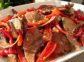 (3)炒勺烧热往油,油热后先下辣椒、花椒,炸至黑紫色,再下猪肝片,待肝熟透即速注汁入勺,汁开后稍翻炒,滴醋,并加入炸花生米即成。