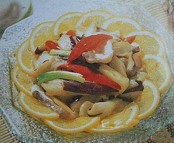 (3)锅内留油,放入姜片、葱煸香锅,投入茄子、鱼片,注入少许鸡汤,调入盐、味精、蚝油,用中火烧透入味,再用湿生粉勾芡即可