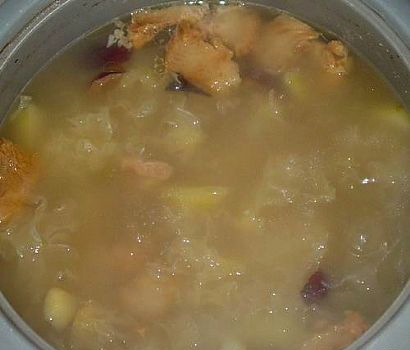 7、改用文火煲2、3个小时,放入雪耳、猴头菇再煲1小时,调盐食用。
