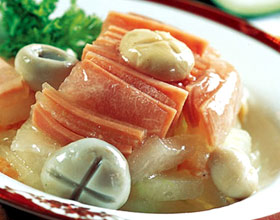 3.火腿片夹入冬瓜内,放入深盘,香菇3朵放在中间,加入高汤、葱(切段)及绍酒8克、白糖8克、精盐、味精各2克、葱、高汤适量,覆上微波薄膜,高火蒸18分钟呈透明状即可。