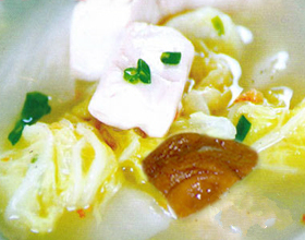 7.倒入高汤(500克)烧沸,加入精盐、味精、料酒、胡椒粉、香菇片、冬笋片和青菜心、豆腐丸稍炖片刻,随即捞入盘中;