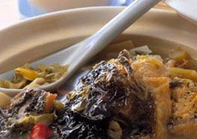 3.炒锅加猪油烧热,下葱、姜爆锅,下料酒、八角、味精、精盐、酸菜煸炒,再加鲜汤,下鲶鱼炖20分钟,淋香油,加胡椒粉即可。