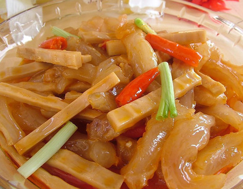 一:将鲜牛筋洗净,加入花椒、姜、葱、香菜、料酒,上笼蒸熟,再将牛筋切成条形待用;