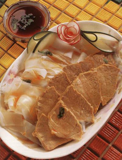 4、将肉片放粉皮上,食时蘸葱蒜汁。