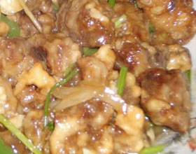 3.锅内留少许油,下葱、姜、蒜、辣椒炒几下,放炸好的肉段,再把兑好的汁入勺翻炒,即可装盘。