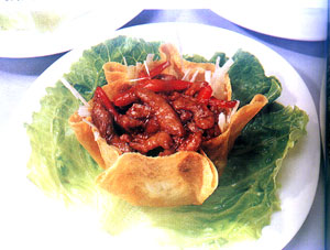 牛肉切丝,加食粉。春卷皮炸成金斗状,放入葱,牛肉丝,加甜面酱及其他调料,炒制。