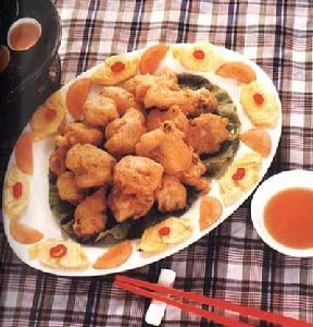 3、炒鼎上火,放入生油,候油热时,将腌好的猪肉逐片沾上面浆下油鼎炸至酥脆,捞起盛在盘中,盘边拼酸甜萝卜即成。上菜时配上甜酱2碟。