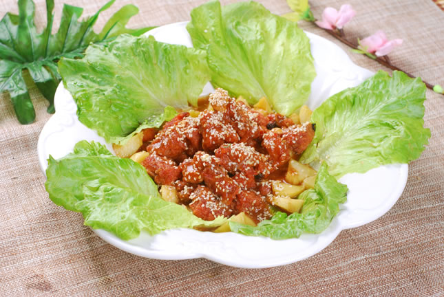 8.沥干油的里脊肉、马蹄倒入调好的味汁盆中,翻颠几下即成。