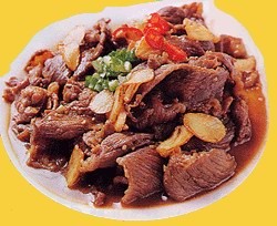 四烧热油2汤匙,放入牛肉略炒,加入蒜茸爆至香,浇酒,炒匀至牛肉仅熟,即可上碟。