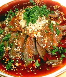 一:将鲜牛筋洗净,加入花椒、姜、葱、香菜、料酒,上笼蒸熟,再将牛筋切成条形待用;