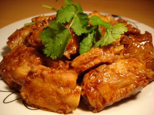 (3)将排骨斩成段,沾上一层薄干淀粉,下入六成热的花生油锅内炸至金黄色捞出,沥去油。