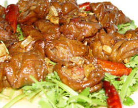2、油锅烧热,小火放砂糖炒糖色,放入小肠、姜、干辣椒、蒜片、老抽、盐、耗油翻炒,加入两杯水,盖锅盖把小肠焖熟。大约30分钟左右。这时出锅的小肠已经能吃了;