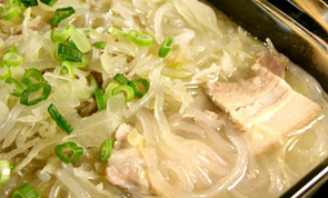 5.将酸菜丝、海米放入汤里小火炖半小时左右,再放入薄五花肉片煮20分钟,加盐调味 即可。
