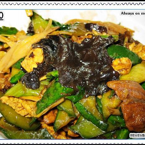 step4:木耳黄花一起下锅,不停的翻炒,然后下刚才爆香的葱花、姜末,炒到木耳、黄花有些油光的时候,倒入鸡蛋和肉片,继续翻炒,放一点酱油,闷一下,最后把黄瓜片儿和油菜放进去翻炒几下,放入盐和鸡精,出锅即可。