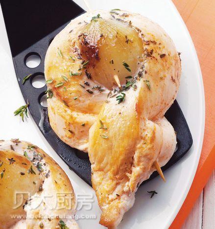 鸡胸肉2片(每片150g),小洋葱4个(每个25g),百里香2汤匙(30g),黄油2汤匙(30g),辣椒粉1/3茶匙(2g),盐1/2茶匙(3g),白胡椒粉1/3茶匙(2g)