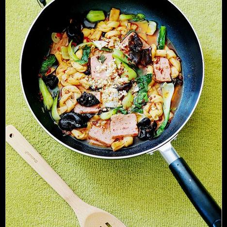 午餐肉,木耳,干豆腐结,白菜,油菜,葱,姜,蒜,,陴县豆瓣酱,花椒,辣椒粉,花椒粉,鸡精,糖,酱油